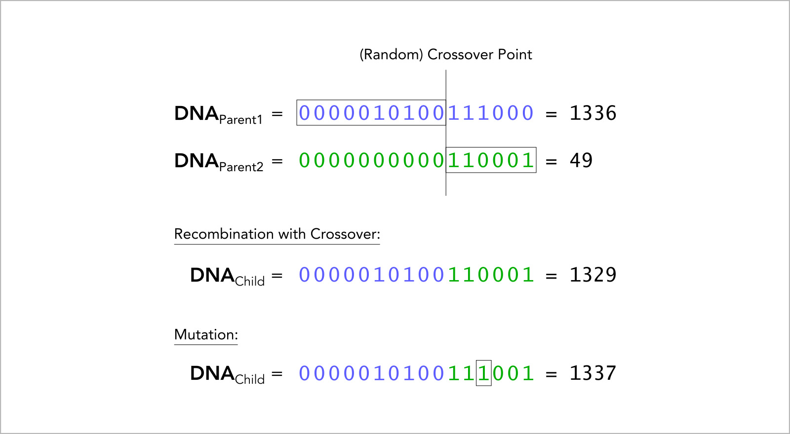 | Recombination / Crossover | A strategy to copy genes from parent DNAs to create new child DNAs |