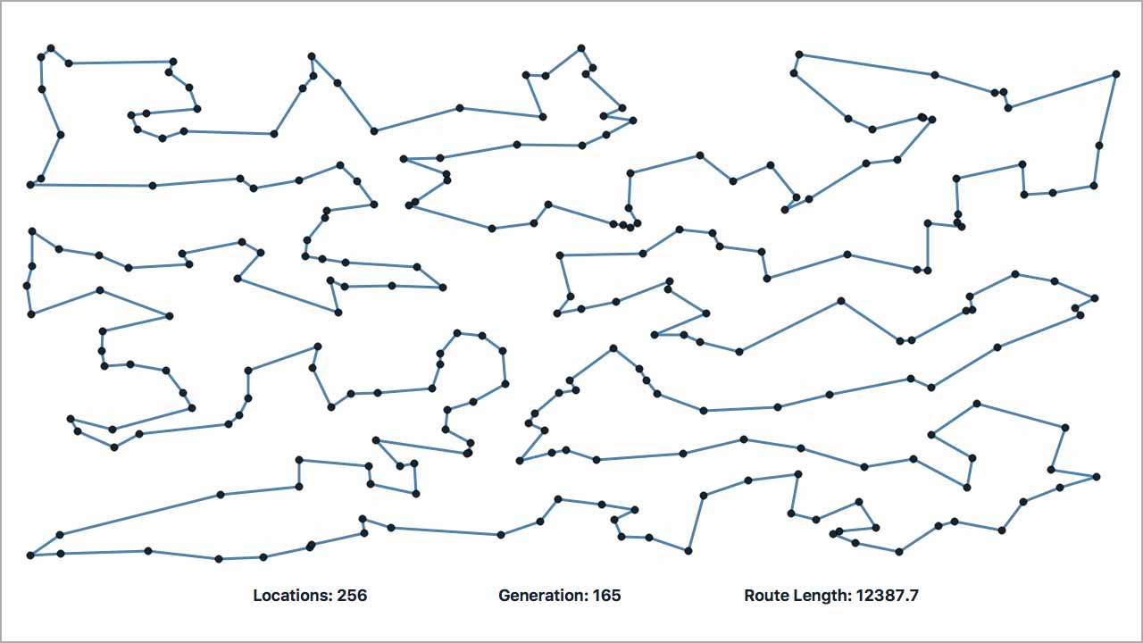 | Fitness Function | Adds up the distances between every pair of cities in the route |
